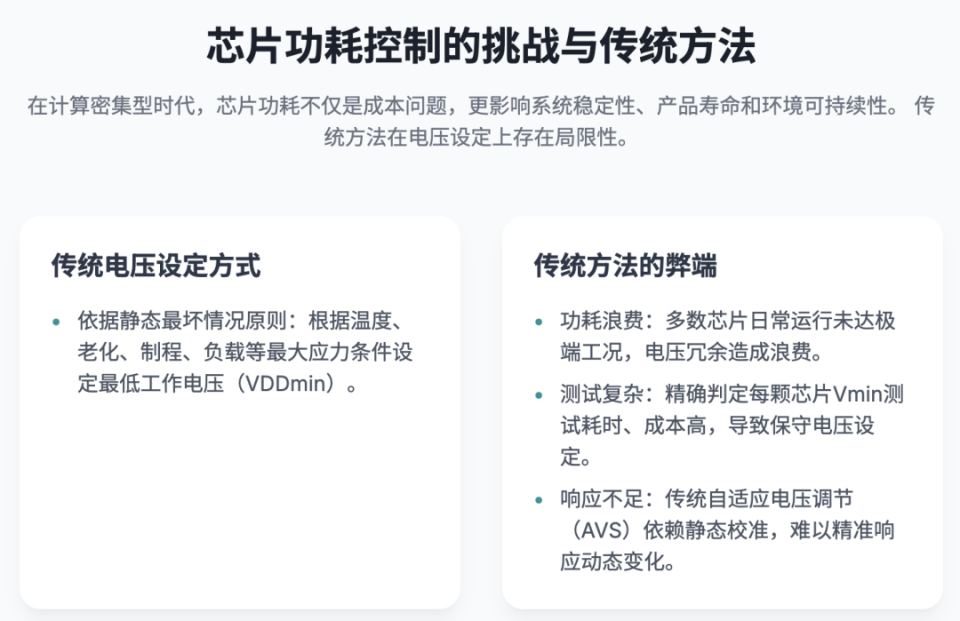 傳統(tǒng)的自適應(yīng)電壓調(diào)節(jié)(AVS)機制雖能實現(xiàn)一定程度的動態(tài)電壓調(diào)整,但通常依賴靜態(tài)校準曲線和固定裕度,難以對運行中實際負載、路徑延遲變化做出精準響應(yīng)。