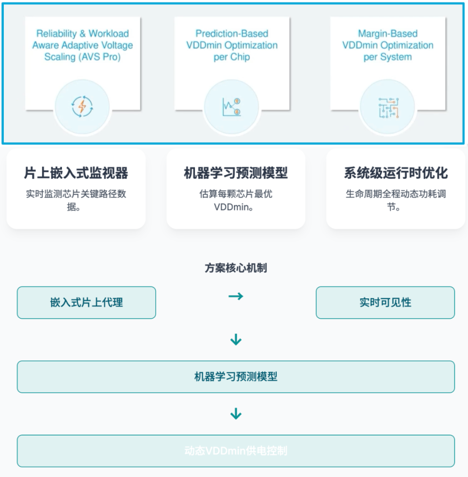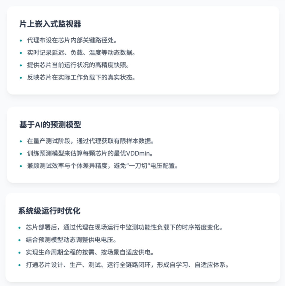 其核心機制在于:通過嵌入式片上代理(embedded agents)對芯片關(guān)鍵路徑進行實時監(jiān)測,結(jié)合機器學習模型預(yù)測每顆芯片、每一運行環(huán)境下的最優(yōu)VDDmin,從而實現(xiàn)更為精細的動態(tài)供電控制。