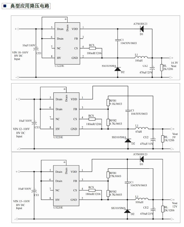 •主要特點(diǎn):VIN: 12~100V(OUT:ADЛ;集成7A 100V (10A 100V) MOS;集成 180V 高壓?jiǎn)?dòng)電路;多模式控制、無(wú)異音工作;支持升壓、降壓和升降壓拓?fù)?默認(rèn)14.3V 輸出(FB 腳懸空);待機(jī)功耗低于 50mw;良好的線性調(diào)整率和負(fù)載調(diào)整率;集成軟啟動(dòng)電路;內(nèi)部保護(hù)功能;過(guò)載保護(hù) (OLP):逐周期電流限制(OCP);輸出過(guò)壓保護(hù)(OVP);VDD 過(guò)壓、欠壓和電壓箝位保護(hù)