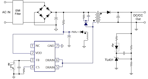 •主要特點:數(shù)字頻率變換技術(shù),提高EMI性能。固定65kHz PWM開關(guān)頻率。電流感測前沿消隱。內(nèi)部同步坡度補償。低待機功耗(<75mW@AC230V);上電時軟啟動,降低MOSFET Vds應(yīng)力;全面保護功能:VCC欠壓鎖滯(UVLO)。VCC的過電壓保護(OVP)。逐周期電流限制。過載保護(OLP)。過熱保護(OTP)。電流限制補償,在通用交流線路輸入中獲得相同的輸出電流。低啟動電流(<10uA@VCC=12V);封裝:DIP-7