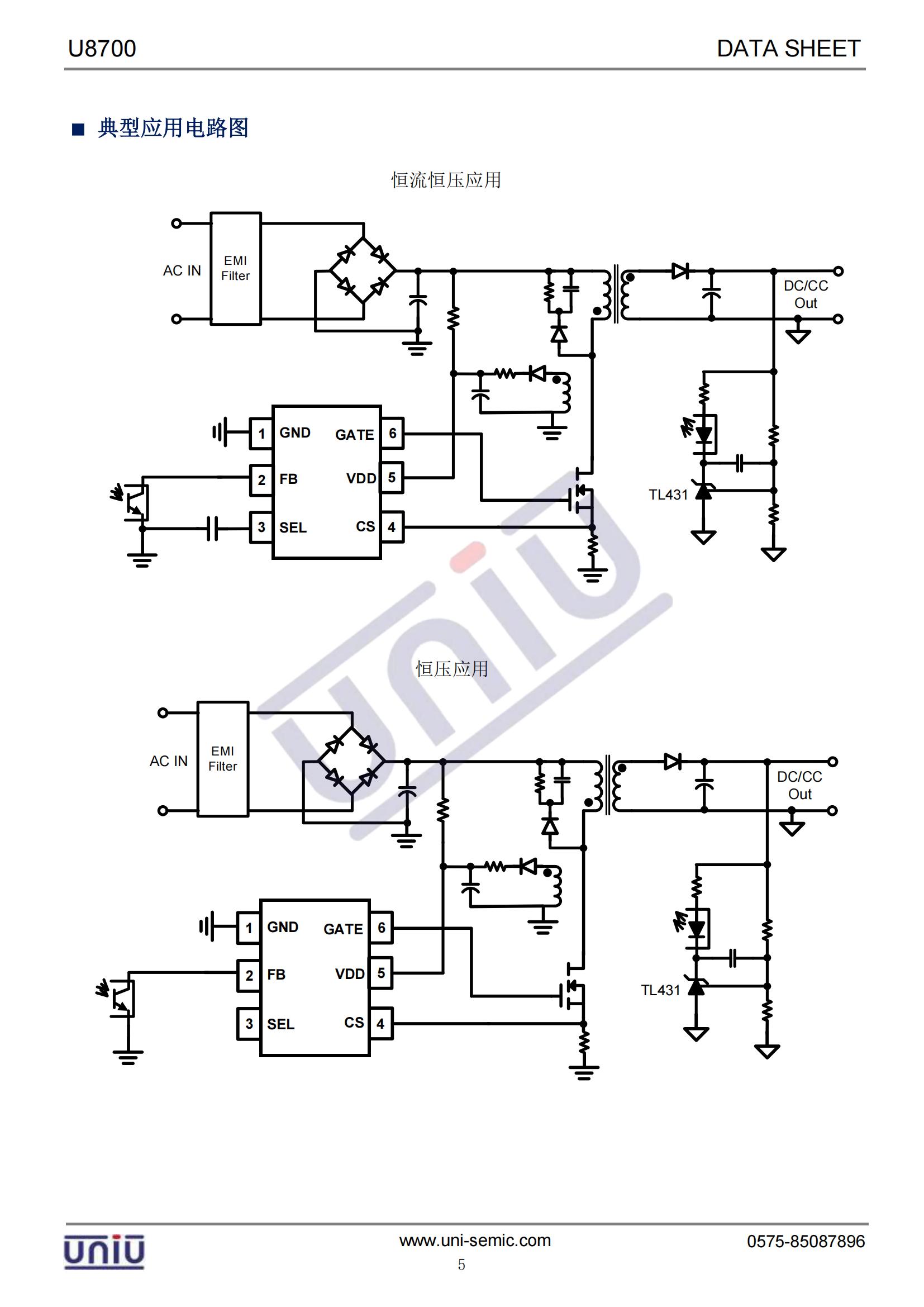 U8700是一款針對離線式反激電源設(shè)計的高性能功率開關(guān)。U8700內(nèi)部具有高精度65kHz開關(guān)頻率振蕩器,且?guī)в卸额l功能可優(yōu)化EMI性能。芯片采用綠色節(jié)能模式和打嗝模式工作,可以保證小于75mW的待機(jī)功耗。U8700集成有完備的保護(hù)功能,包括:VDD欠壓保護(hù)(UVLO)、VDD過壓保護(hù)(OVP)、逐周期電流限制、短路保護(hù)(SCP)、過載保護(hù)(OLP)、過熱保護(hù)、軟啟動、VDD箝位和CS管腳開路保護(hù)等。