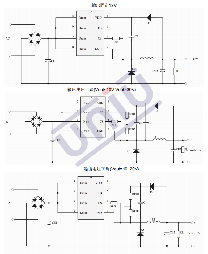 主要特點(diǎn):集成 500V 高壓?jiǎn)?dòng)電路;多模式控制、無(wú)異音工作;支持降壓和升降壓拓?fù)?默認(rèn) 12V 輸出( FB 腳懸空);待機(jī)功耗低于 50mW;良好的線性調(diào)整率和負(fù)載調(diào)整率;集成軟啟動(dòng)電路;內(nèi)部保護(hù)功能 :過(guò)載保護(hù) (OLP);逐周期電流限制 (OCP);輸出過(guò)壓保護(hù) (OVP);VDD 過(guò)壓、欠壓和電壓箝位保護(hù)