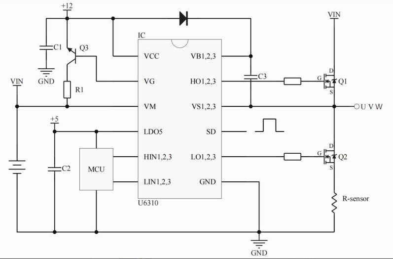 •主要特點:懸浮絕對電壓: 70V;VM電壓范圍:5.0-70.0V; U6311 集成比較器(基準 200mV);兼容3.3/5V 輸入邏輯;驅(qū)動電流:+1.5A/-1.8A(typ.);死區(qū)時間: 250ns (typ.);集成VCC和VBS欠壓保護;集成12V LDO控制電路;集成5.0V LDO;5V LDO集成輸出短路保護;過流檢測(U6311);負瞬態(tài)電壓承受能力;集成共模噪音消除電路;CPC24、SSOP24、QFN28 封裝