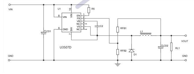 •產(chǎn)品描述:U3507D是一個高壓降壓開關(guān)穩(wěn)壓器內(nèi)置MOSFET。它集成了一個高側(cè)、高電壓、功率MOSFET,通常電流限制為10A(IPK)。輸入范圍適應(yīng)各種降壓應(yīng)用,使其成為汽車,工業(yè)和照明應(yīng)用的理想選擇。遲滯電壓模式控制采用非??斓捻憫?yīng)。UNIU專有的反饋控制方案最大限度地減少了所需外部組件的數(shù)量。開關(guān)頻率為150KHz,允許元件尺寸小。熱停機和短路保護(SCP)提供可靠和容錯的操作。低靜態(tài)電流允許U3507D用于電池供電的應(yīng)用。U3507D采用DFN5*6-10封裝,帶外露襯墊。