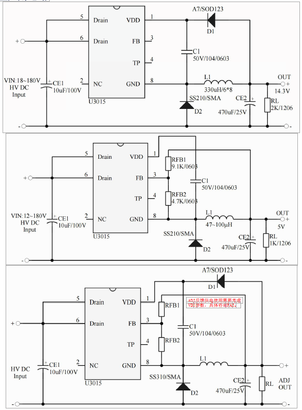 •主要特點(diǎn):WN: 12~180V(OUT:ADJ);集成 2.5A 180V MOS;集成 200V 高壓啟動(dòng)電路;多模式控制、無異音工作;支持降壓和升降壓拓?fù)?默認(rèn)14.3V 輸出(FB 腳懸空);待機(jī)功耗低于 50mw;良好的線性調(diào)整率和負(fù)載調(diào)整率;集成軟啟動(dòng)電路;內(nèi)部保護(hù)功能:過載保護(hù)(OLP);逐周期電流限制(OCP);輸出過壓保護(hù)(OVP);VDD 過壓、欠壓和電壓箝位保護(hù)。